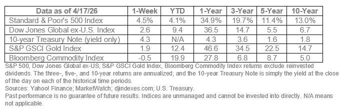 1.) Enthusiasm about the prospect of peace. Investor optimism surged on the possibility of an end to the Middle East conflict. “The stock market has now delivered a year’s return in about two weeks. While that might not be quite as impressive as all summer in a day, it’s been enough to provide a genuine reset for investors. The ‘end’ of the Iran war spurred a market celebration this week, even if the conflict is nowhere near officially over,” reported Teresa Rivas of Barron’s.
