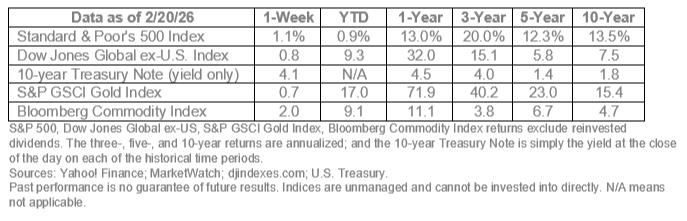 - Strong company performance continued. Overall, companies in the Standard & Poor’s 500 (S&P) Index did very well in the fourth quarter of 2025. The Index appears to be on track to deliver its fifth consecutive quarter of double-digit earnings growth. In mid-February, the Index’s blended year-over-year earnings growth rate was13.2 percent, reported John Butters of FactSet.